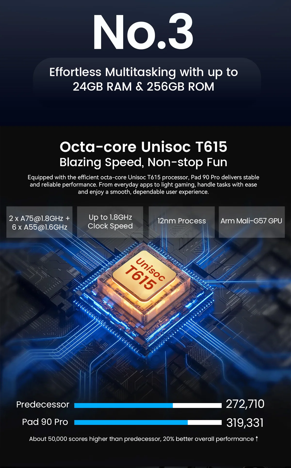 CPU: Octa-core Unisoc T615,2 x A75@1.6GHz + 6 x A55@1.6GHz