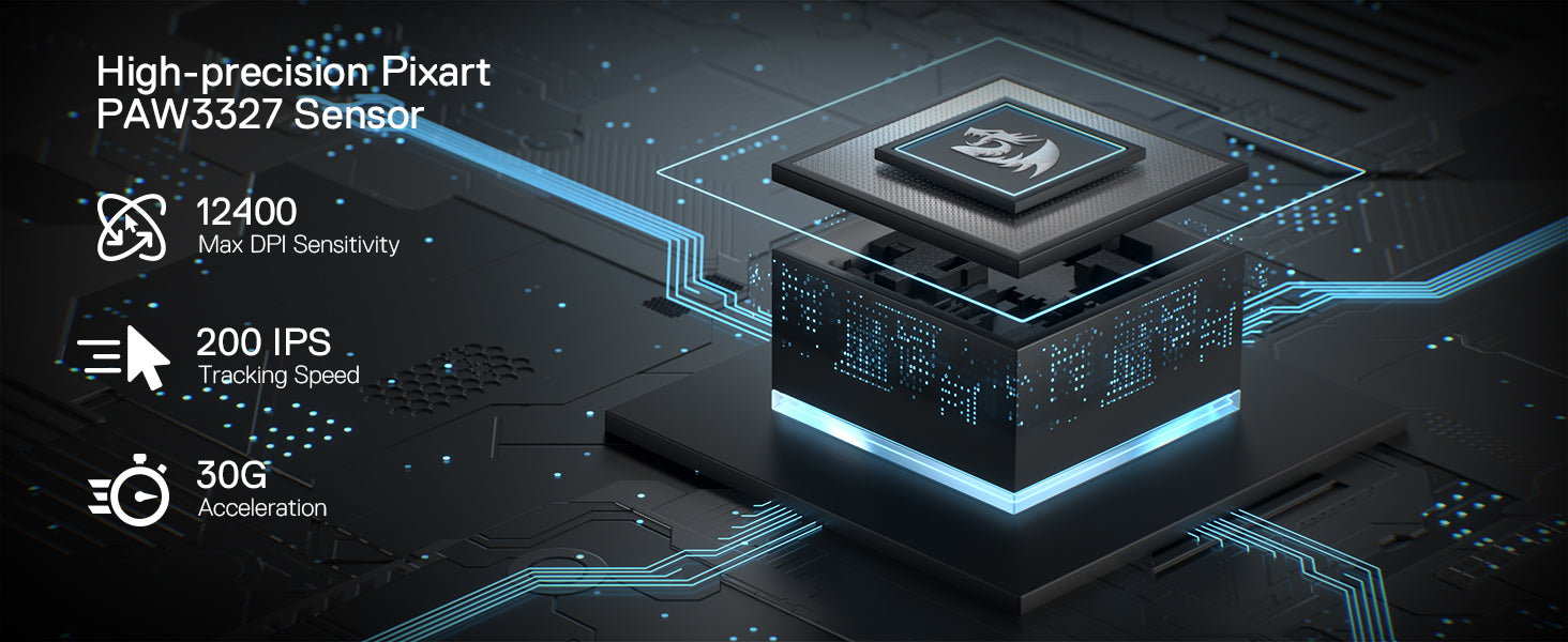 At the heart of the M908 is a high-precision Pixart PMW3327 sensor with up to 12,400 DPI. Out of the box, you get five on-the-fly DPI stages (500/1000/2000/3000/6200) so you can shift sensitivity between sniping and fast flicks without opening software. Want it dialed in perfectly? The software lets you fine-tune in ±100 DPI steps from 100 to 12,400.