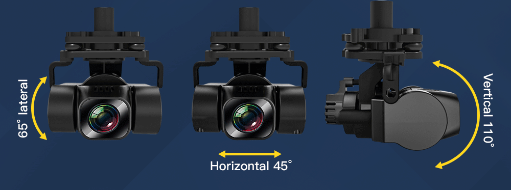 1.Three - axis mechanical self - stabilizing Gimbal,Lateral Angle:65°,Horizontal Angle:45°,Vertical Angle:110 °